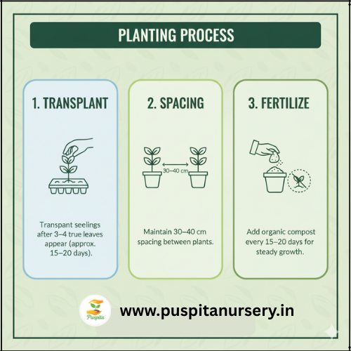 Transplant seedlings after 3–4 true leaves appear (approx. 15–20 days).