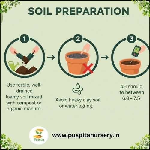 Use fertile, well-drained loamy soil mixed with compost or organic manure.