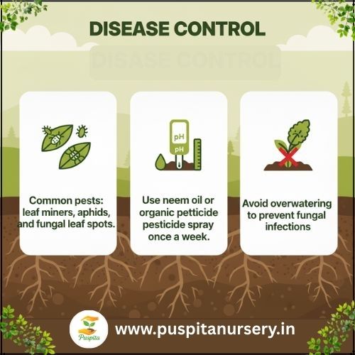 Common pests: leaf miners, aphids, and fungal leaf spots.