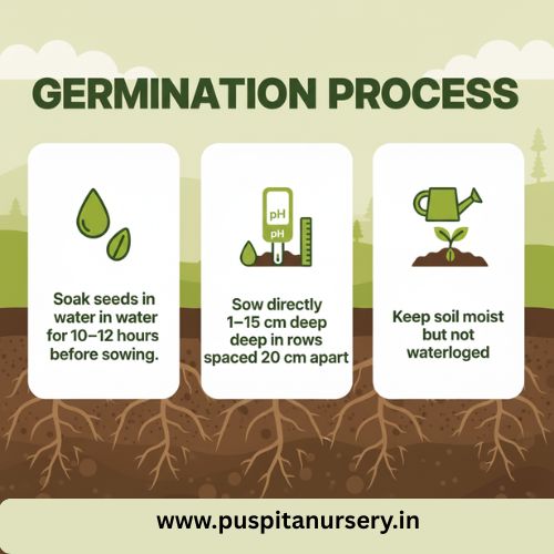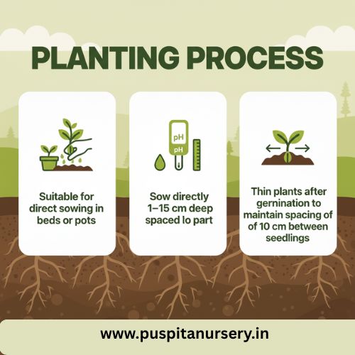 • Sow directly 1–1.5 cm deep in rows spaced 20 cm apart.
